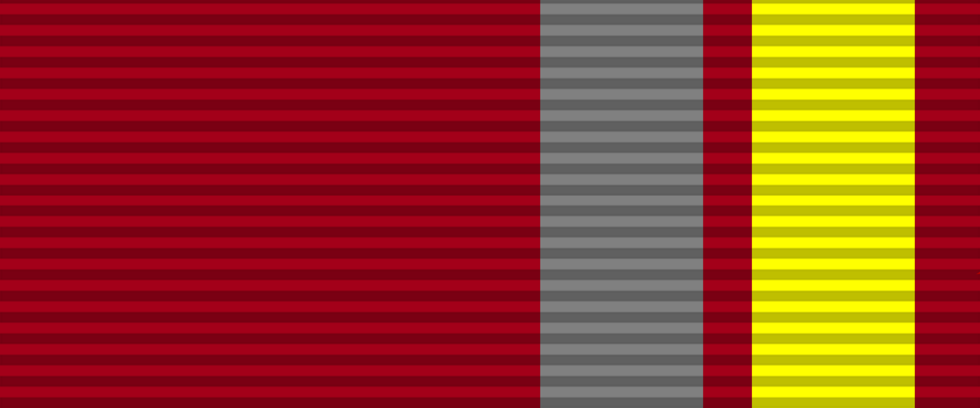 Знак ордена при помощи ушка и кольца соединяется с пятиугольной колодкой, обтянутой шелковой муаровой лентой красного цвета с серой и желтой продольными полосками.